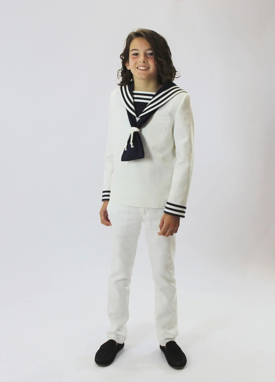 Traje Marinero Niño Primera Comunión. Casaca blanca combinada con azul marino y pantalón blanco a juego