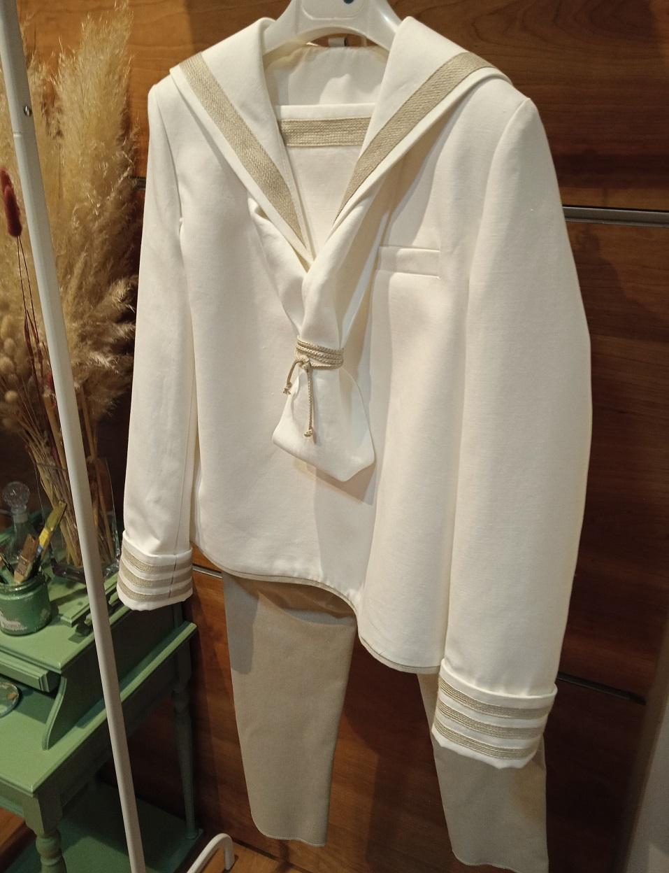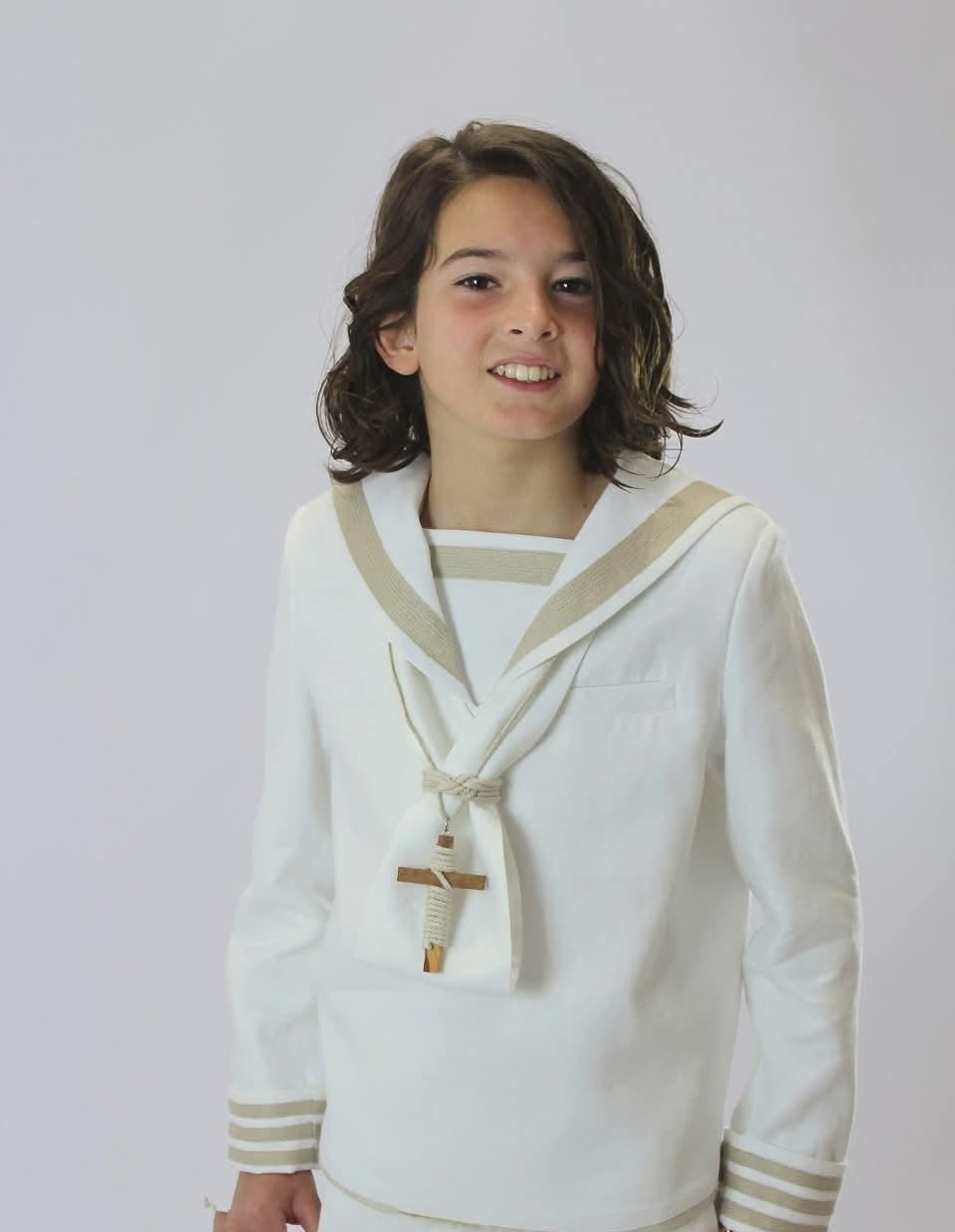 Traje Marinero Primera Comunión Niño. Casaca blanca combinada con beige y pantalón beige. En la foto viene con el pantalón blanco, pero nosotros lo vendemos en beige a juego con los detalles de la casaca. Ver la segunda foto