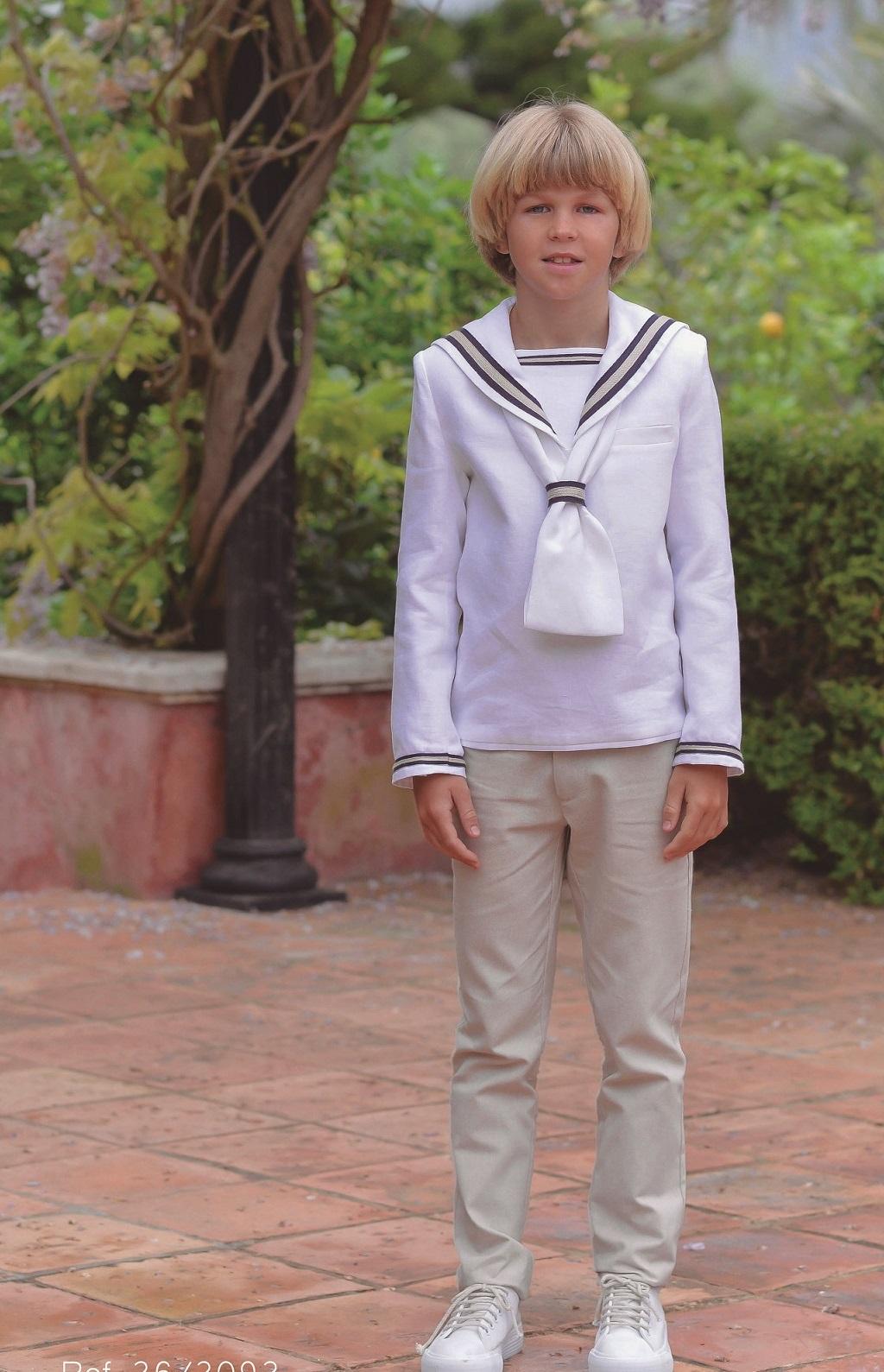 Traje Marinero Primera Comunión. Casaca blanca combinada con azul y camel y pantalón a juego en camel