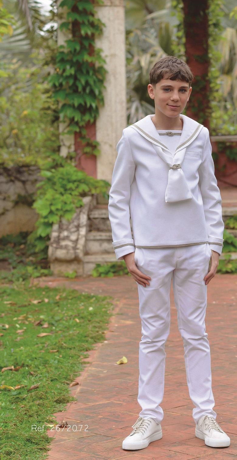 Traje Primera Comunión Marinero. Casaca blanca combinada con beige y pantalón Beige. En la foto viene con el pantalón en blanco. Nosotros lo vendemos con el pantalón beige. Mirar la segunda foto.