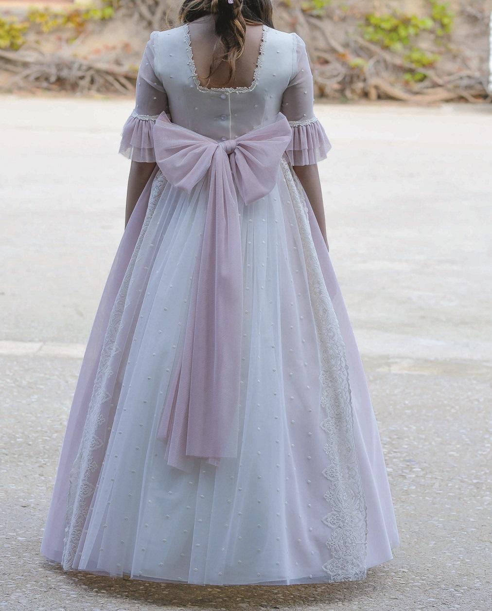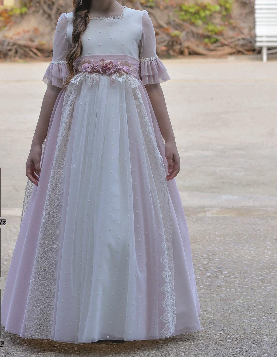 Vestido Primera Comunón en tul con topo bordado y bordados a los extremos, conbinado con tul rosa y cinturón con flores