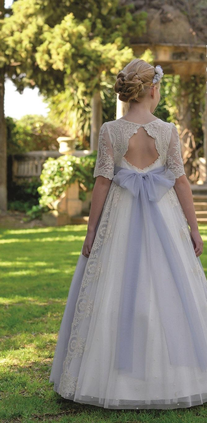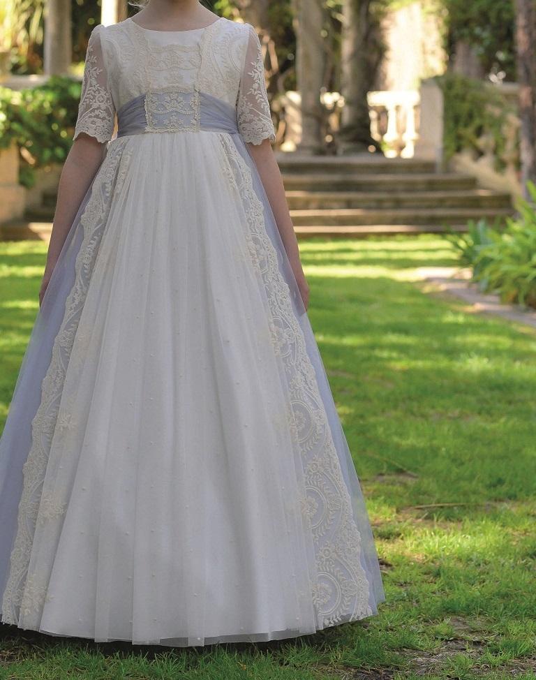Vestido Primera Comunión en tul bordado con aberturas laterales combinado con azul