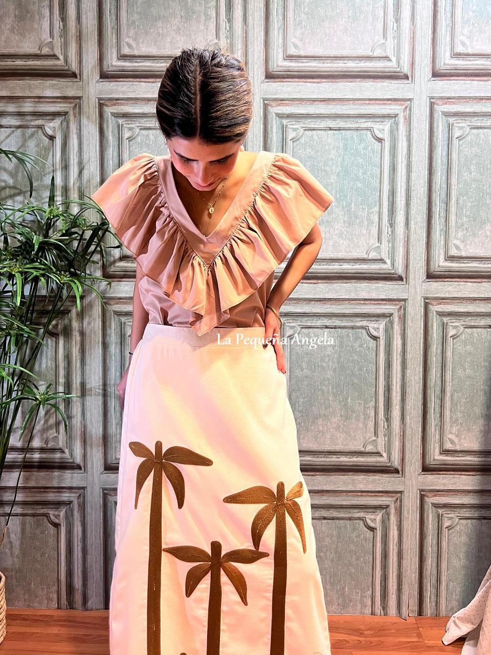 Falda en color beige con bordado en la parte delantera de palmeras. La parte trasera el tejido es liso con goma. La puedes combinar con la blusa Leotta