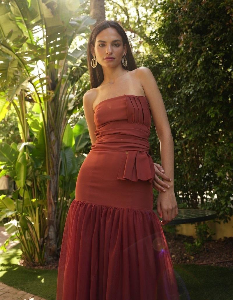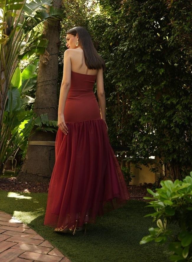 Es el vestido perfecto para bodas de noche. Confeccionado en tejido de tul con licra y bioelástico. Favorecedor escote palabra de honor con detalle de tablón en cintura. La falda en tul va unida con frunce al cuerpo. Lleva cremallera invisible en espalda. Ideal para cualquier evento de noche.