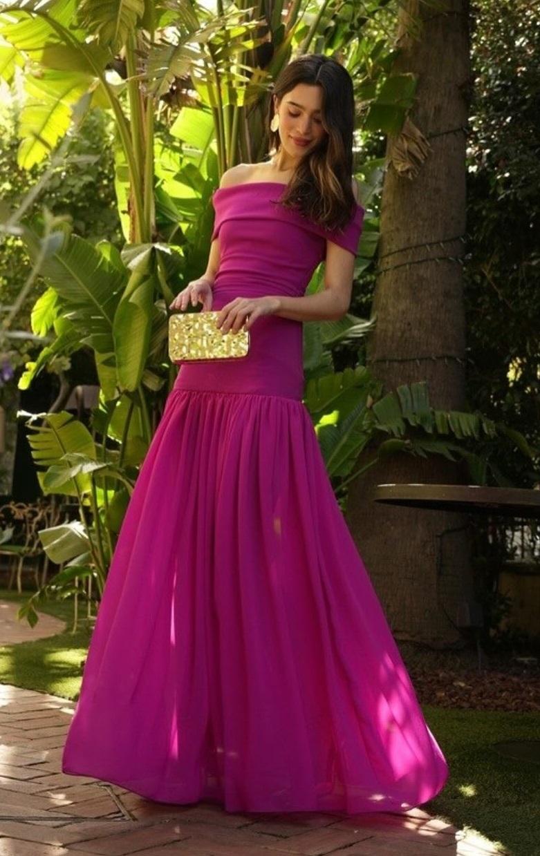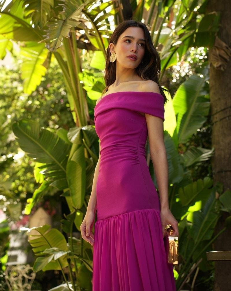 Es el vestido perfecto para bodas de noche. Confeccionado en tejido crep con licra. Tiene amplio escote bañera y el cuerpo termina con corte en la cadera. Favorecedor draperado en la parte de la cintura. La falda es en tejido de gasa y destaca por su amplia abertura. Ideal para cualquier evento de noche.