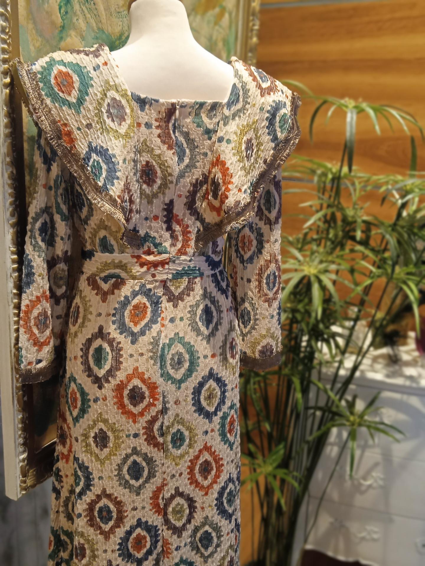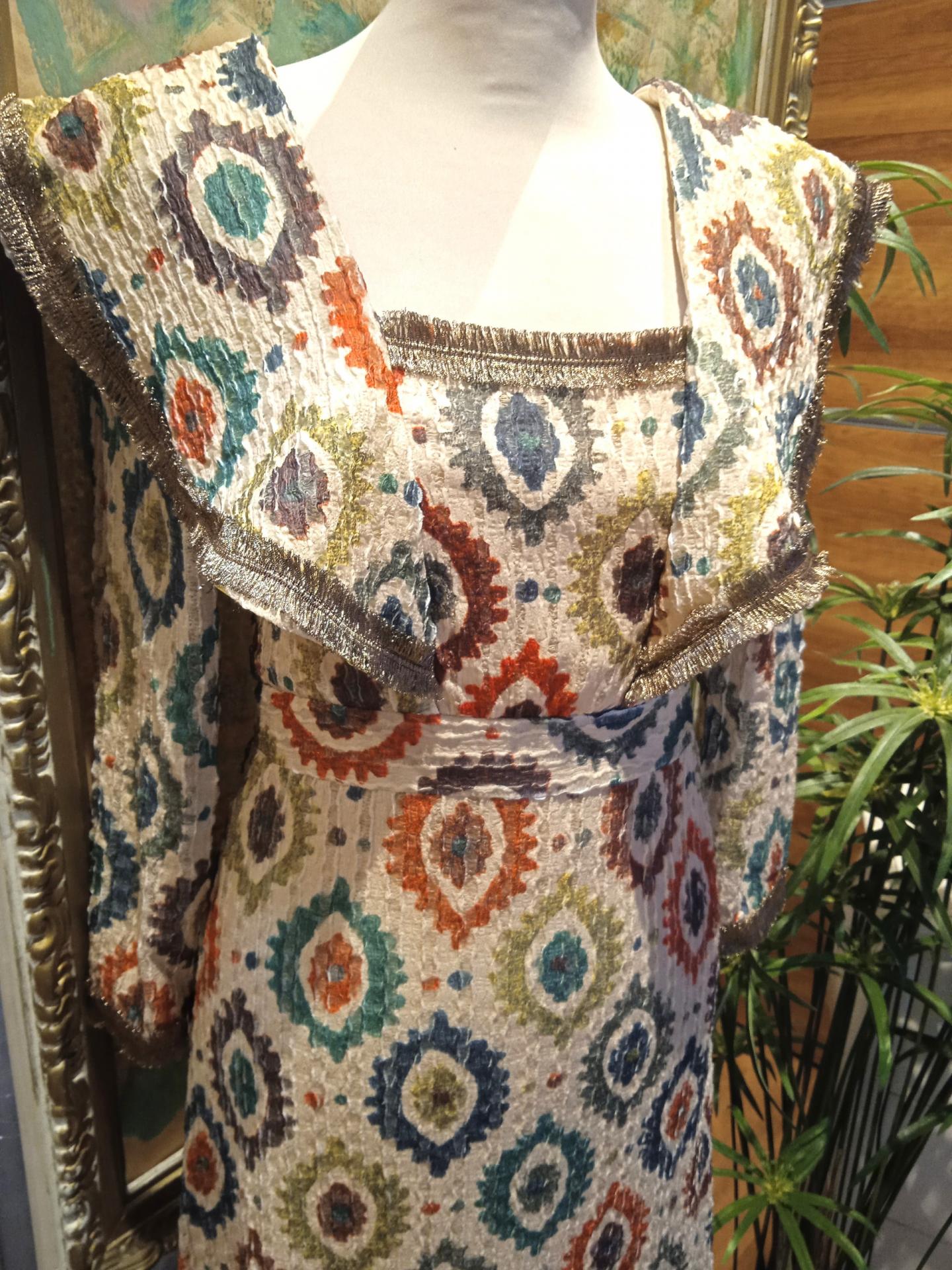 Vestido midi con estampado etnico en crep de punto, tejido elástico. Es tejido tiene mucha caida y un tacto muy agradable. Lleva cremallera invisite en la espalda, con solapas desde la parte delantera a la trasera. Es ideal!!