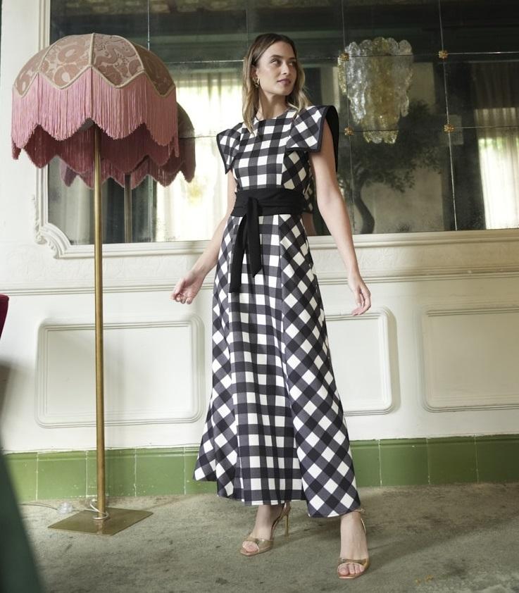 El Vestido Bass está confeccionado en tejido bioelástico de alta calidad con un elegante estampado de cuadros. Su corte nejas estiliza la figura, mientras que las solapas con vivo y el cinturón a la cintura aportan estructura y feminidad al conjunto. Cuenta con cremallera trasera.