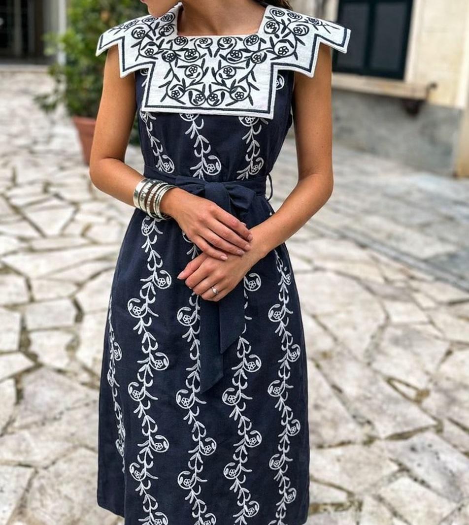 Elegante vestido en azul marino bordado en blanco con cuello blanco bordado en marino. Dependiendo de los complementos lo puedes usar para eventos o tú dia a día.