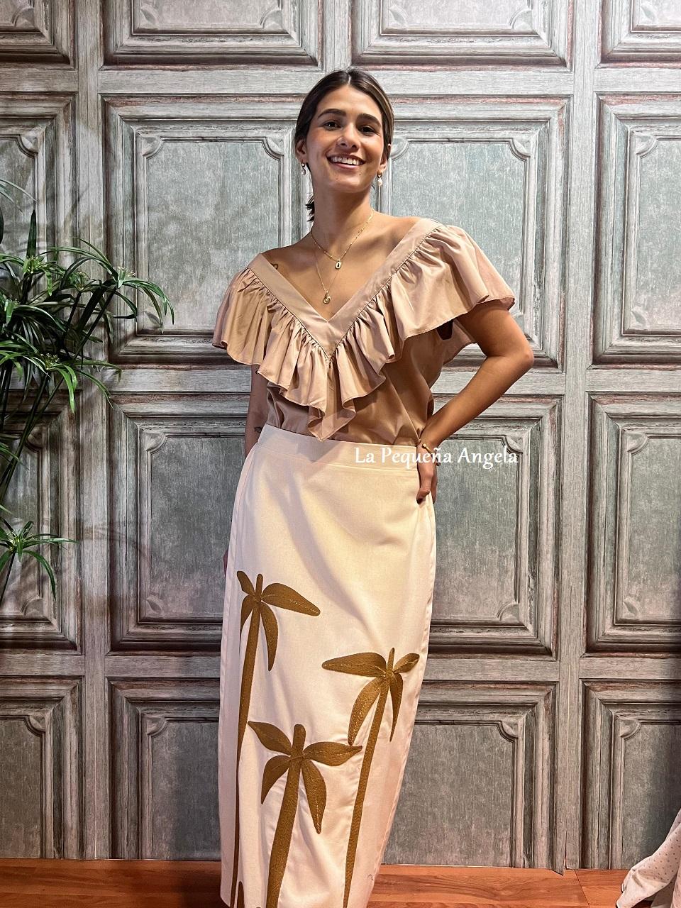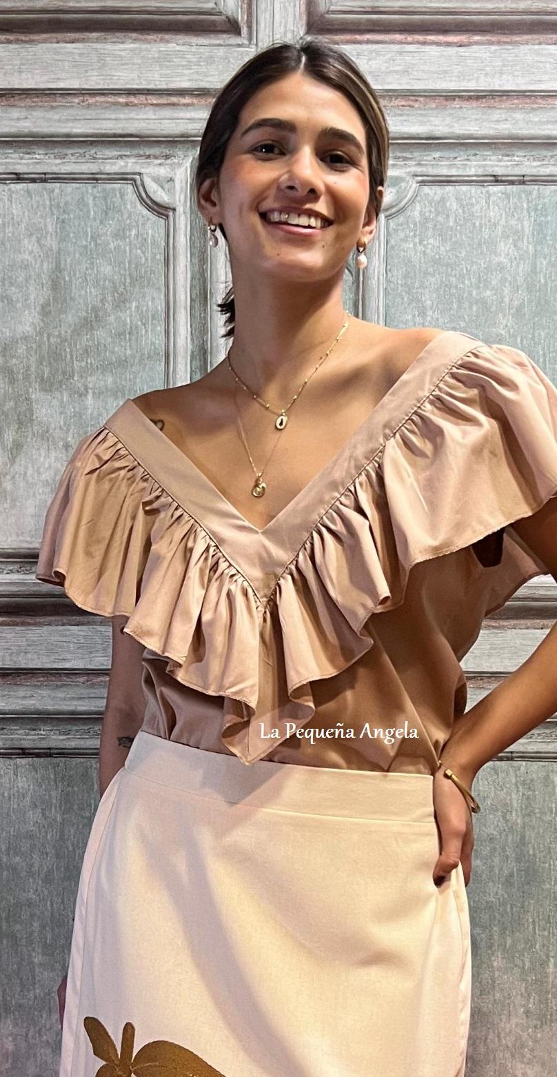 Blusa camel con escote en pico y volante en la parte delantera y trasera.