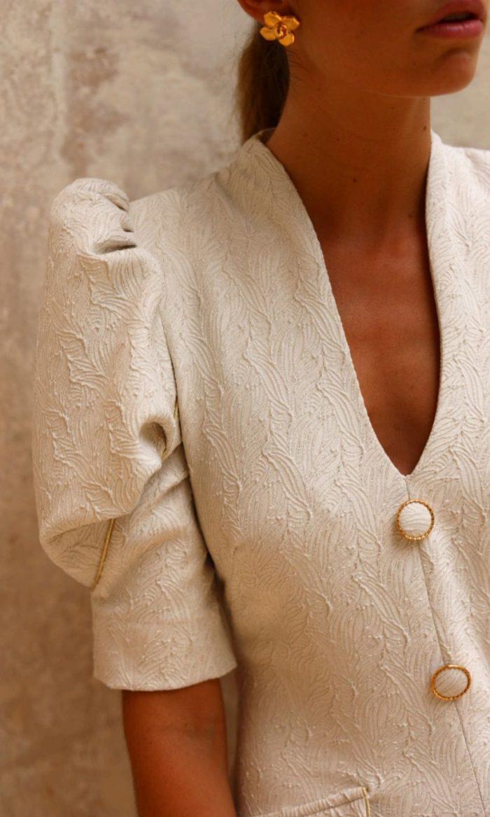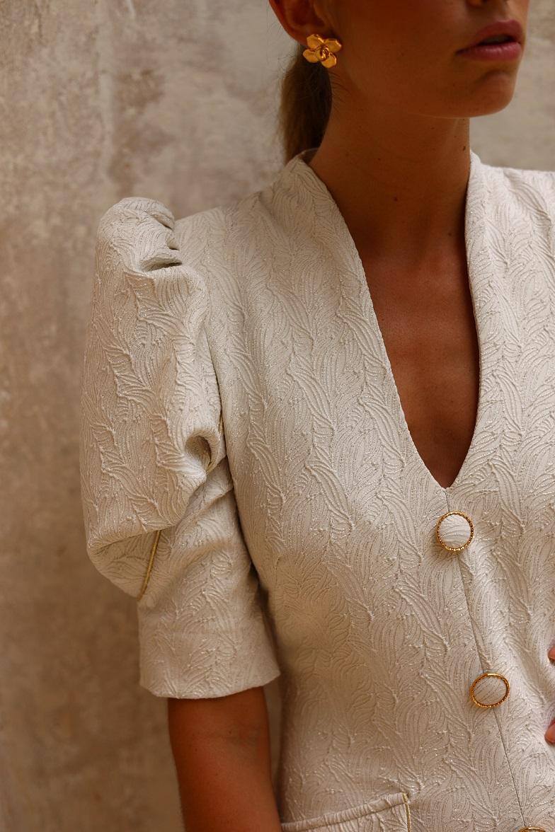 Vestido de Magnolia Kobus en largo midi de invitada confeccionado en tejido jacquard en color marfil, con relieve y estructura que aporta cuerpo, firmeza y un acabado elegante. Un diseño pensado para mujeres que buscan un vestido especial para eventos de día, celebraciones formales o looks de madrina y madre de comunión. El escote en V estiliza visualmente el torso y alarga la figura, mientras que las mangas cortas abullonadas con hombro marcado aportan presencia y equilibrio a la silueta. El corte entallado en cintura define la forma sin ajustar en exceso, y la falda recta de largo midi crea una línea limpia y favorecedora. La parte frontal se realza con botones decorativos dorados, que recorren el vestido en vertical y añaden un detalle cuidado que eleva el conjunto. Las tapetas decorativas a la altura de la cadera aportan estructura visual y refuerzan ese aire refinado.