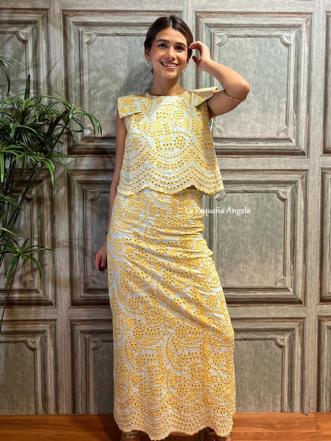 Conjunto Top y Falda calado con bordado en amarillo. Top sin mangas con solapas y falda tubo recta con cremallera lateral y goma en cintura.