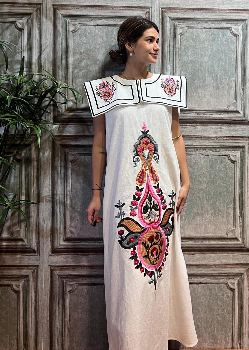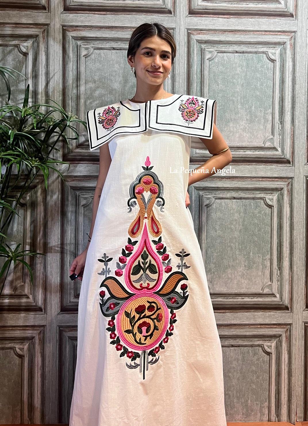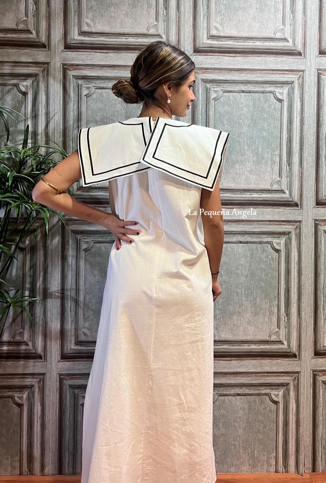 Vestido Midi en color blanco con bordado central en la parte delantera y solapas.