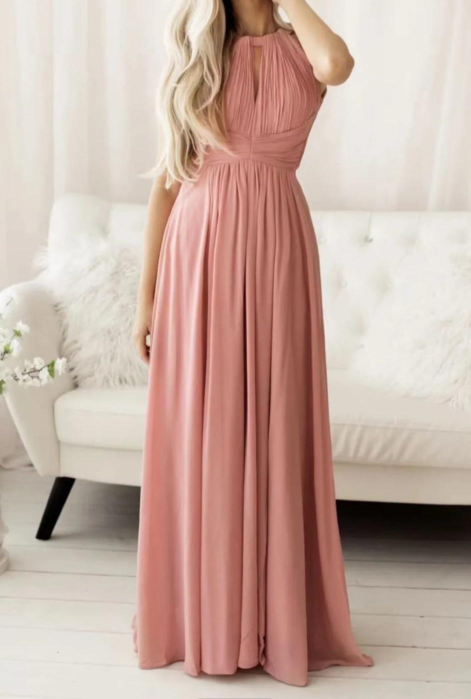 Vestido largo de gasa en rosa empolvado. Ideal para Invitadas Boda y Graduaciones