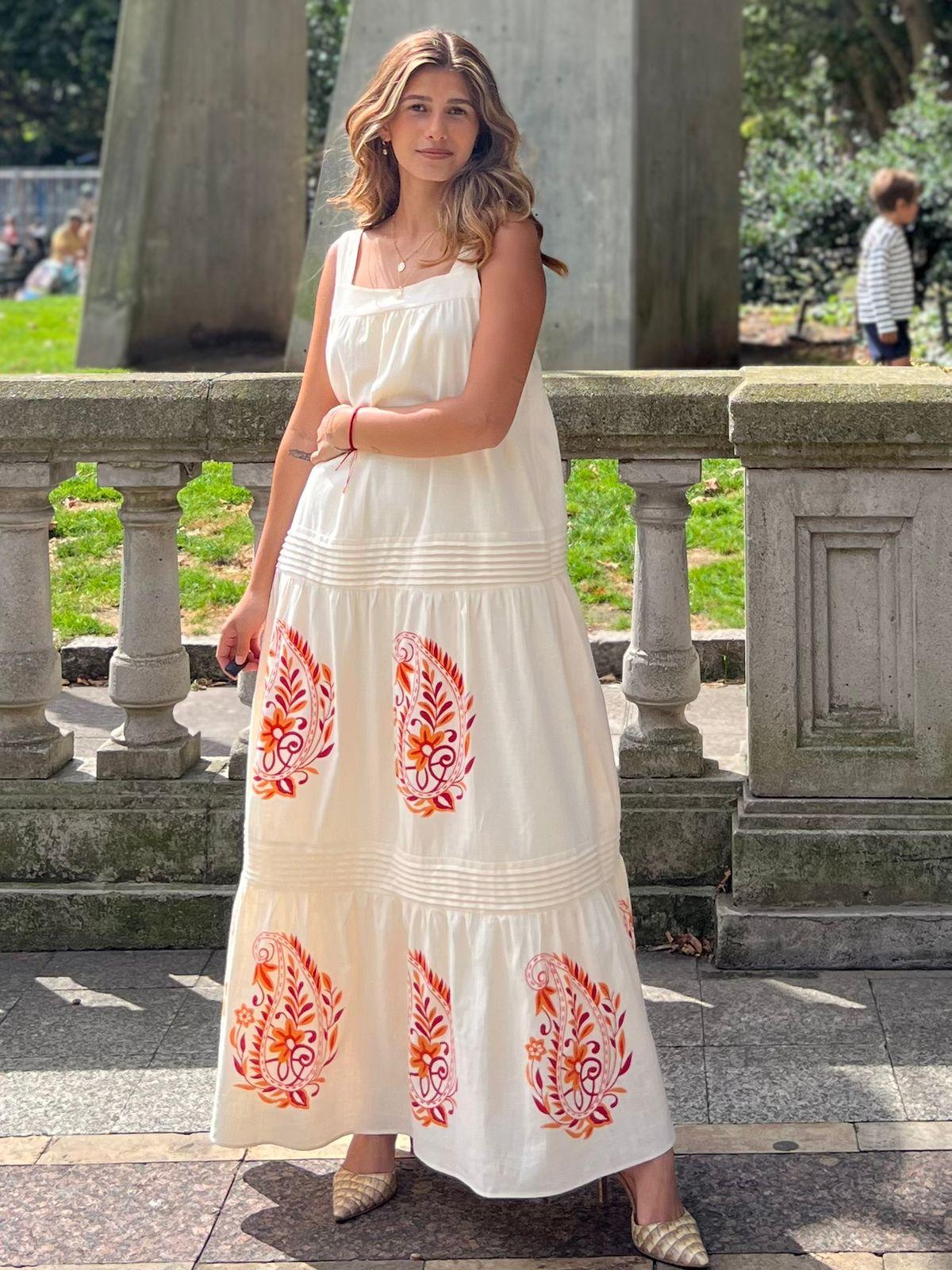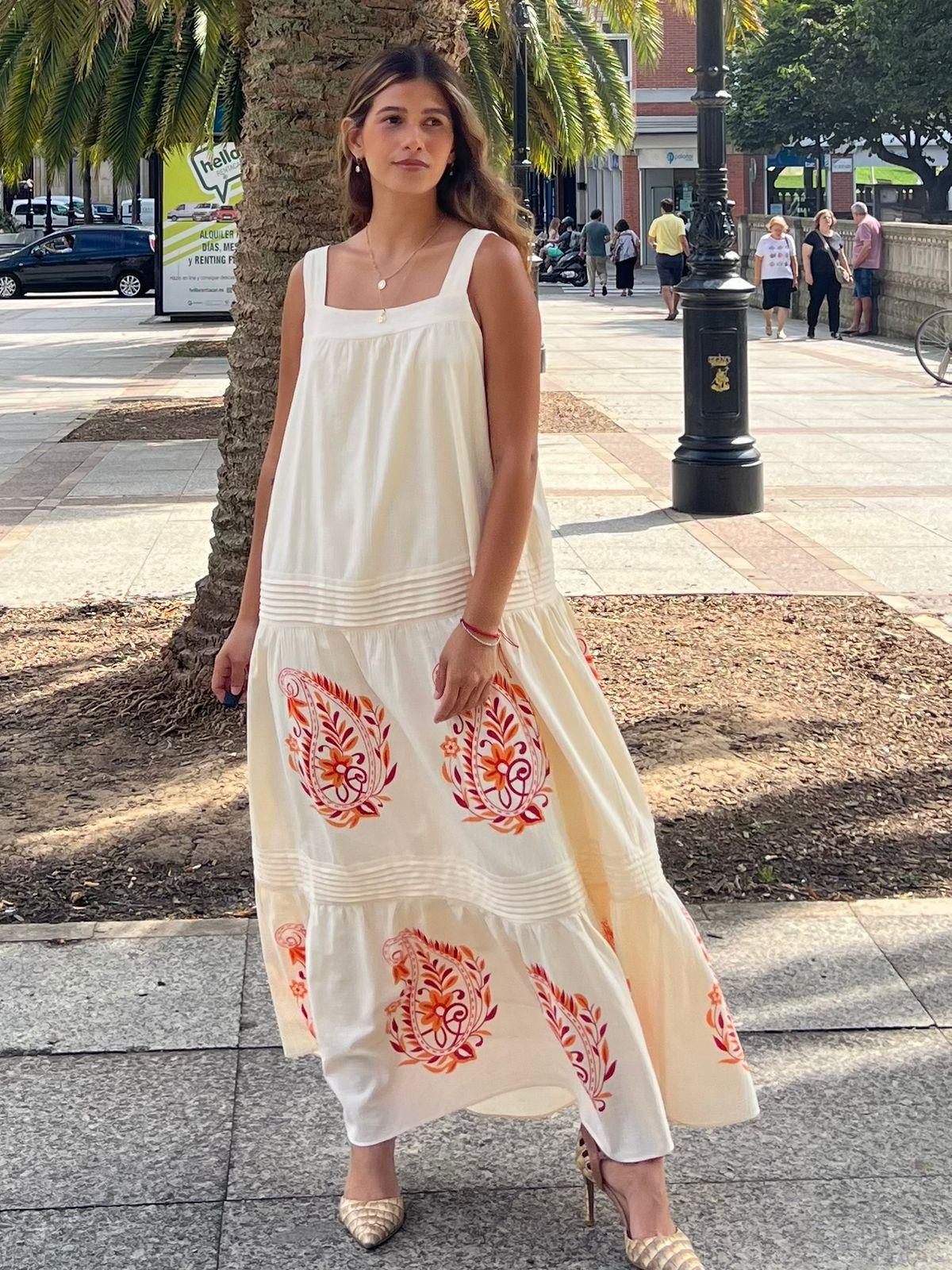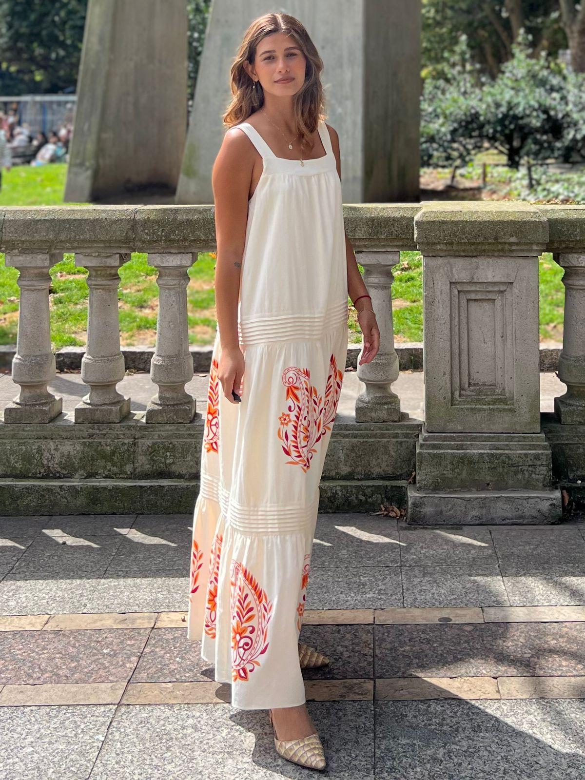 Vestido suelto de tirantes estilo boho en color beige con dibujo estampación en naraja y rojo