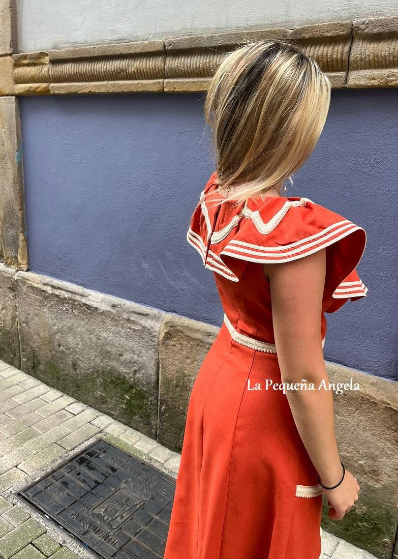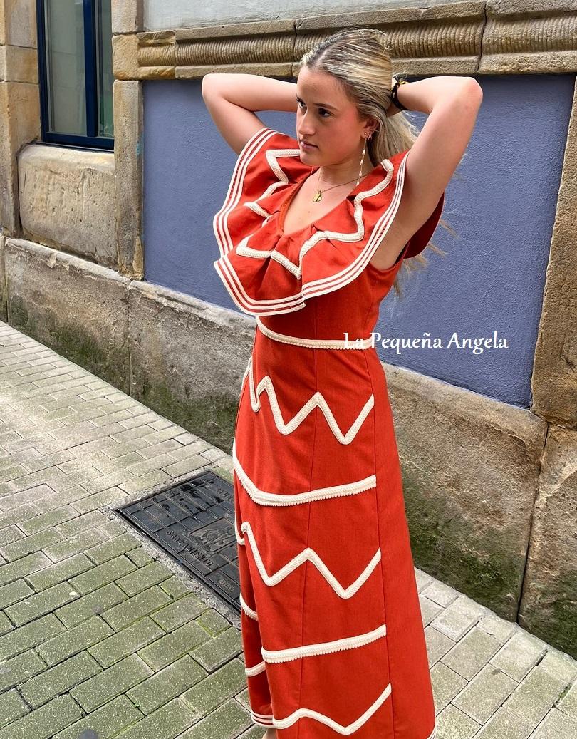 Vestido en color camel anaranjado con volante en el cuello y detalles en blanco roto. Ideal para el verano
