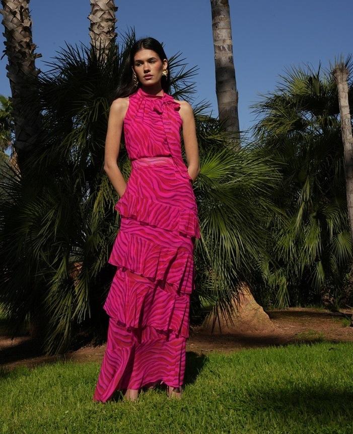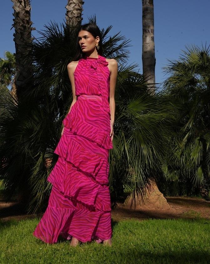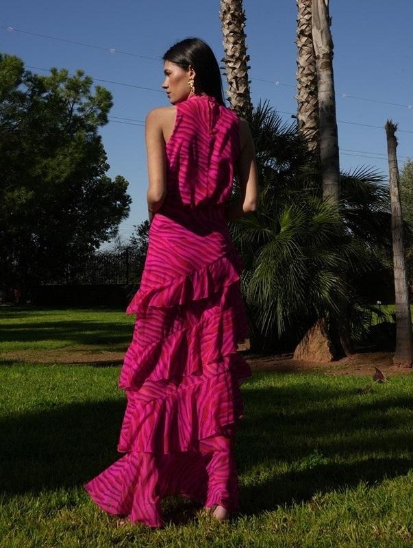 El conjunto Selena en color fucsia, confeccionado en tejido de gasa estampada, es una opción vibrante y sofisticada para cualquier evento especial o como vestido de invitada. El top con detalle de lazada aporta un toque femenino y romántico, mientras que la falda con volantes y forro garantiza movimiento, comodidad y una caída elegante. Ideal para bodas, bautizos, comuniones o celebraciones, este conjunto combina color, textura y detalles para un look moderno y lleno de estilo.